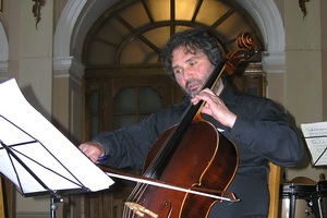 А ще на стінах – картини Ореста Скопа, Олега Денисенка, Ольги Блажко. Зауважую також кілька робіт відомого львівського фотохудожника Олексія Іутіна. На одній із них – віолончеліст Мигаль.