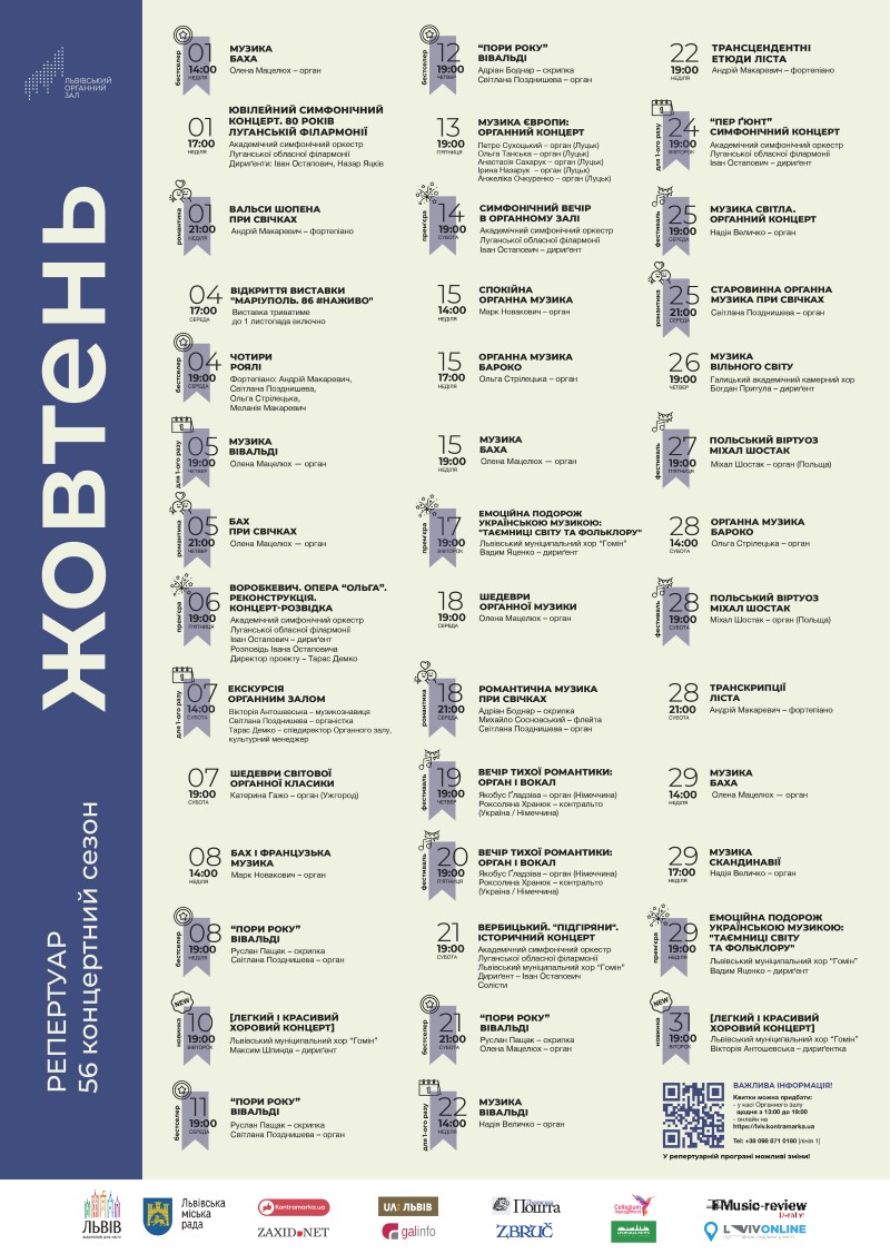 Чекатиме на львівʼян у жовтні багато запрошених органістів, зокрема 7 жовтня “Шедеври світової органної класики” гратиме Катерина Гажо з Ужгорода 13 жовтня відбудеться концерт “Музика Європи”, де виступатиме головний органіст Луцького кафедрального собору та викладач Петро Сухоцький разом із своїми ученицями: Ольгою Танською, Анастасією Сахарук, Анжелікою Очкуренко та Іриною Назарук.