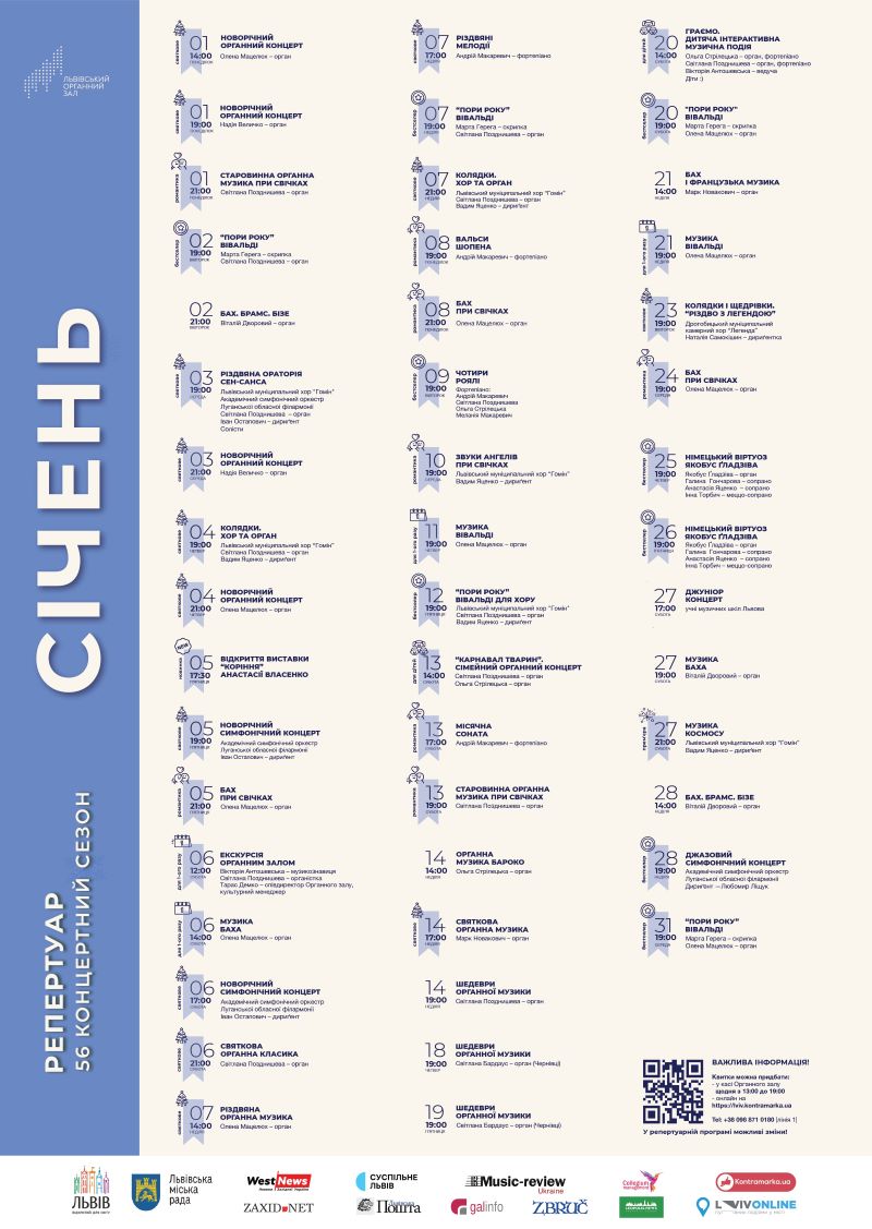 І, як завжди, у січні багато концертів солістів Львівського органного залу – органістів Світлани Позднишевої, Ольги Стрілецької, Олени Мацелюх, Віталій Дворового, Марка Новаковича, піаніста Андрія Макаревича.