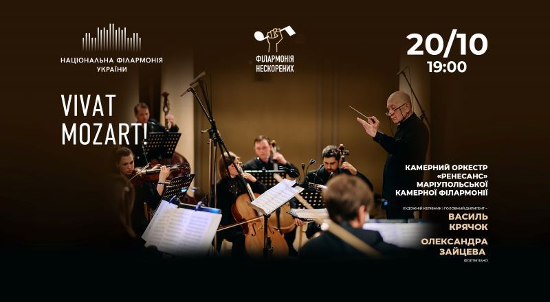20 жовтня улюбленець публіки Камерний оркестр «Ренесанс» Маріупольської камерної філармонії запрошує на програму «Vivat Моzаrт!» під орудою диригента Василя Крячка, який відбудеться у межах проєкту «Філармонія нескорених».