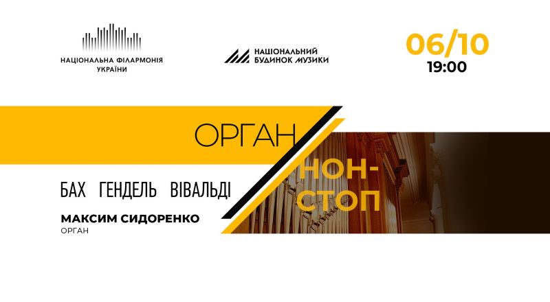 6 жовтня. «Орган нон-стоп». У черговому своєму органному речиталі соліст Національного Будинку музики Максим Сидоренко представить свій улюблений репертуар періоду епохи бароко – прозвучать твори Баха, Генделя й Вівальді.