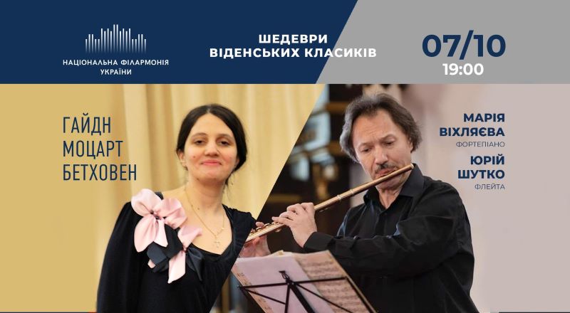 7 жовтня геніальна музика віденських класиків звучатиме у виконанні знаних солістів – флейтиста Юрія Шутка та піаністки Марії Віхляєвої у програмі «Шедеври віденських класиків».