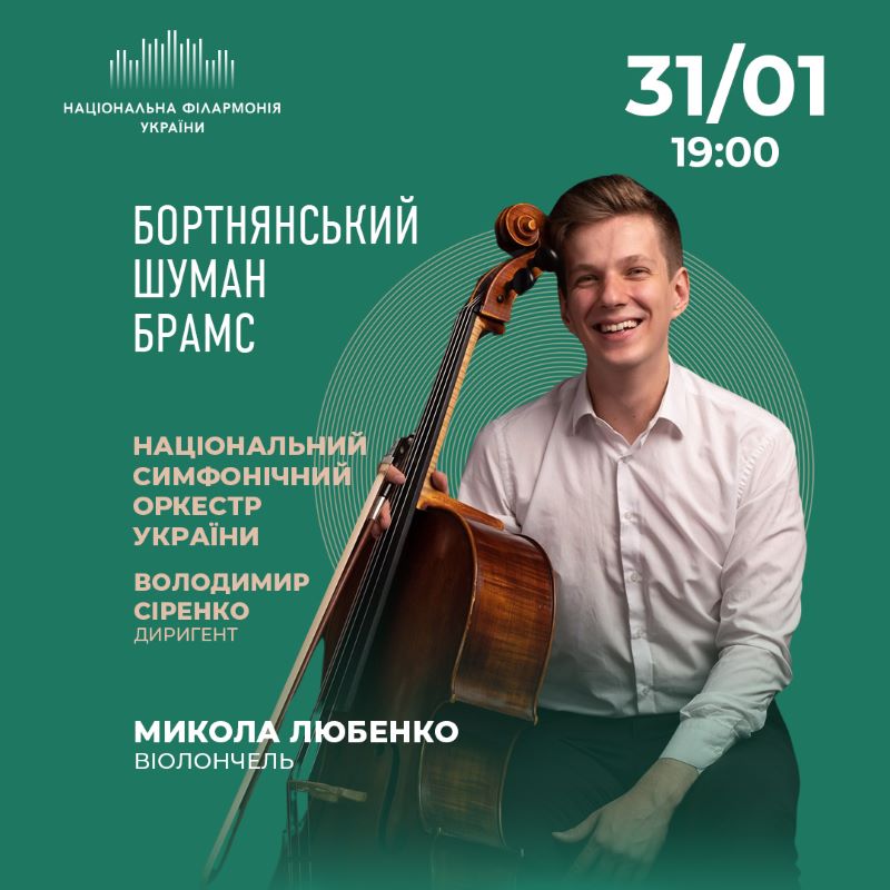 31 січня на сцені Колонного залу імені Миколи Лисенка віолончеліст Микола Любенко у супроводі Національного симфонічного оркестру України під орудою дириґента Володимира Сіренка виконає яскравий та єдиний віолончельний концерт Шумана.