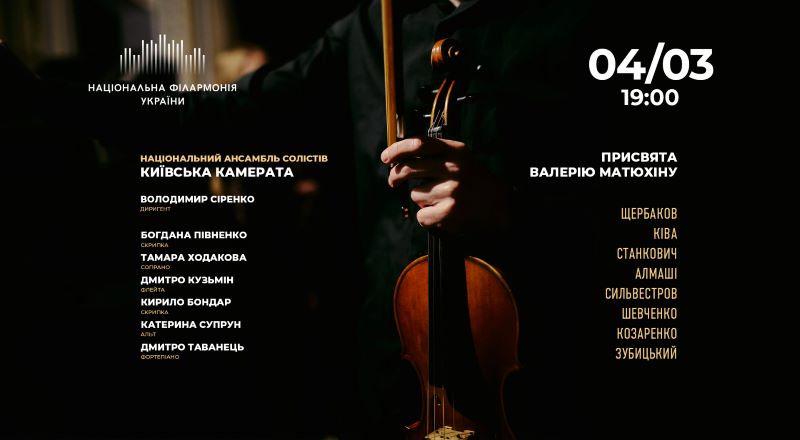Цей виступ Національного ансамблю солістів “Київська камерата” присвячений 75-річчю від дня народження засновника і незмінного керівника колективу Валерія Матюхіна.