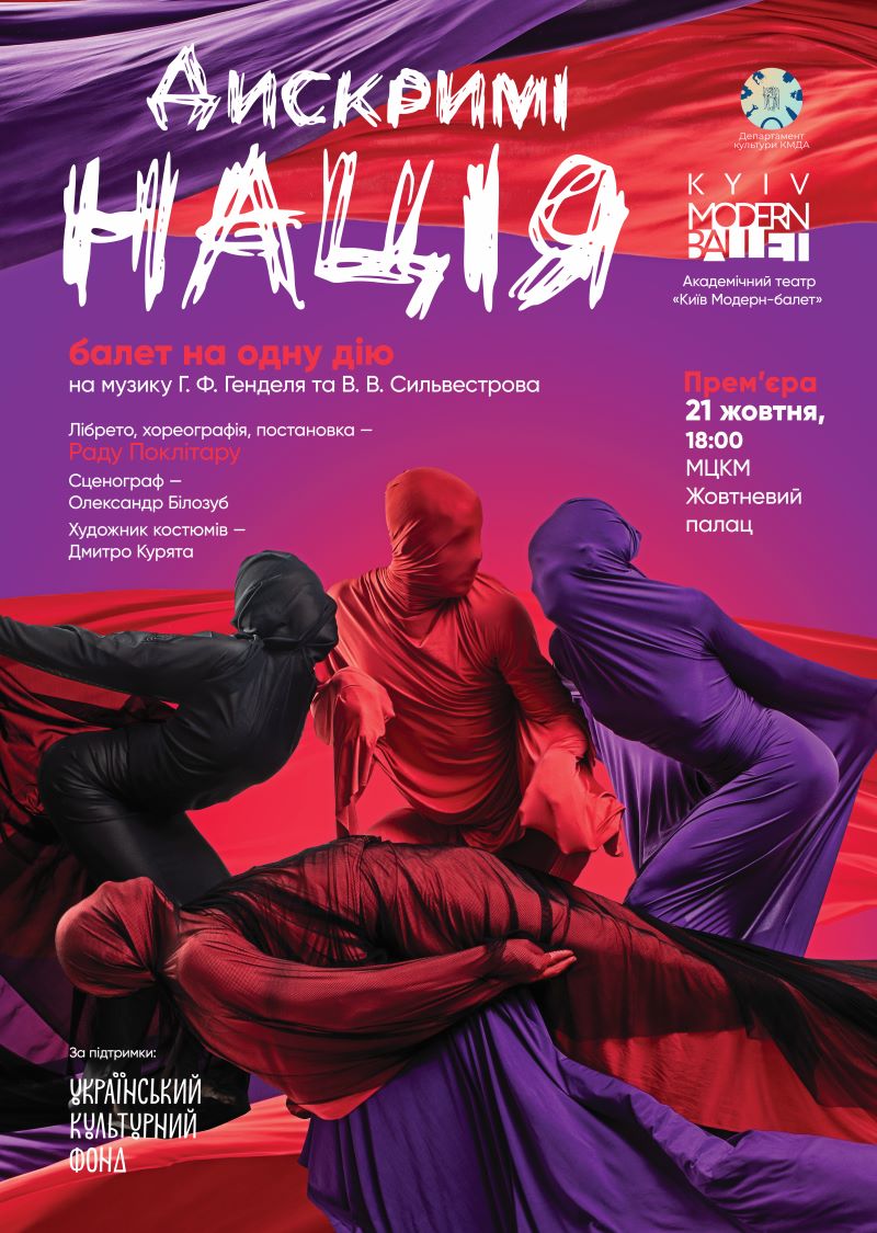Наш балет «ДискриміНАЦІЯ» – це вистава-роздум, яка складатиметься з ряду новел, кожна буде мовою танцю і пластики «розповідати» про проблеми тієї чи іншої дискримінації. Вже два номери я зробив: вступ до балету й один із номерів у середині постановки. Я отримую величезне задоволення від роботи з танцівниками нашого театру. Знаєте, так швидко можу працювати лише з артистами «Київ Модерн-балету», бо ми один одного розуміємо з півслова.