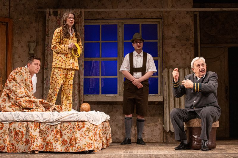 Дія комедії відбувається у невеличкому готелі французького містечка на кордоні з Німеччиною. Вистава легка за жанром, але вона дає можливість зіркам Наталії Сумській (Хельга), Богдану Бенюку (Клод) і Василю Мазуру (Карак) продемонструвати високий майстер-клас, як для публіки (яка захоплено аплодує практично після кожної фрази), так і для молодих колег (Денису Мартинову і Валерію Величку, які по черзі виконують роль Хью, Тетяні Кришталь і Анастасії Рулі - вони грають роль Бренди, образ красуні Симони створили Дар’я Легейда і Тетяна Шляхова, а менеджера готелю Хайнца виконує В’ячеслав Хостікоєв), аби граючи разом на сцені, вчитися філігранно володіти акторською професією.