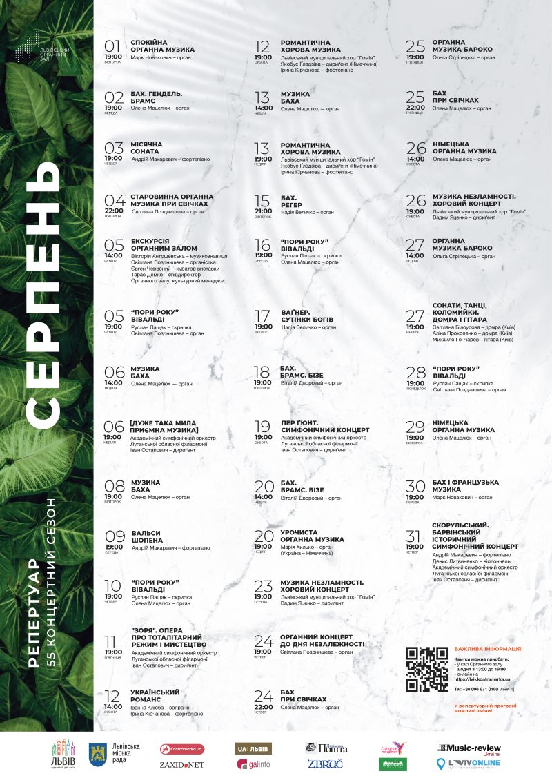 У серпні Львівський органний зал готує 36 подій