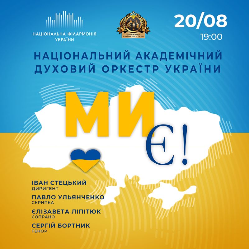 Велику чотириденну Симфонію Незалежності у Колонній залі Національної філармонії України відкриє 20 серпня Національний духовий оркестр України концертом з життєствердною назвою «МИ Є!».