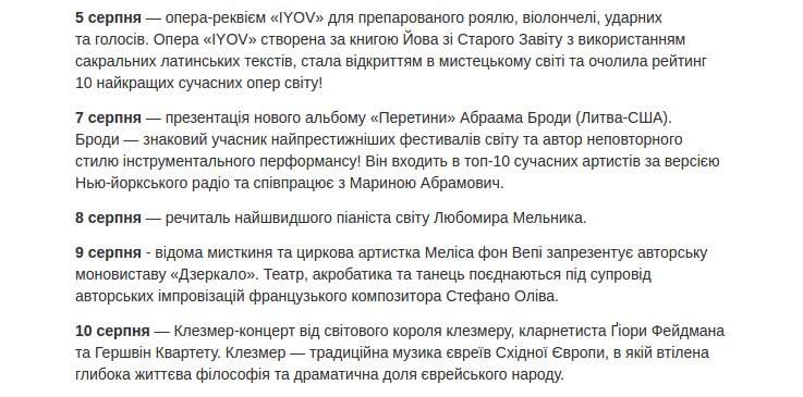 В рамках фестивалю львів'яни зможуть насолодитися масштабними концертними постановками, перформенсами, вечорами камерного формату, цікавими презентаціями, виставками та навіть науковим симпозіумом.