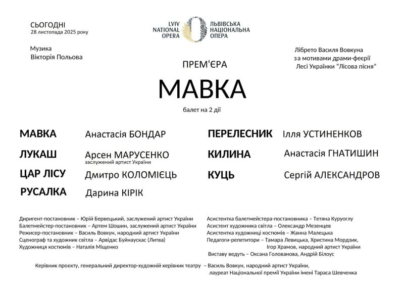 28 листопада Львівська національна опера розпочала цикл прем’єрних показів балету-феєрії «Мавка» на музику композиторки Вікторії Польової.