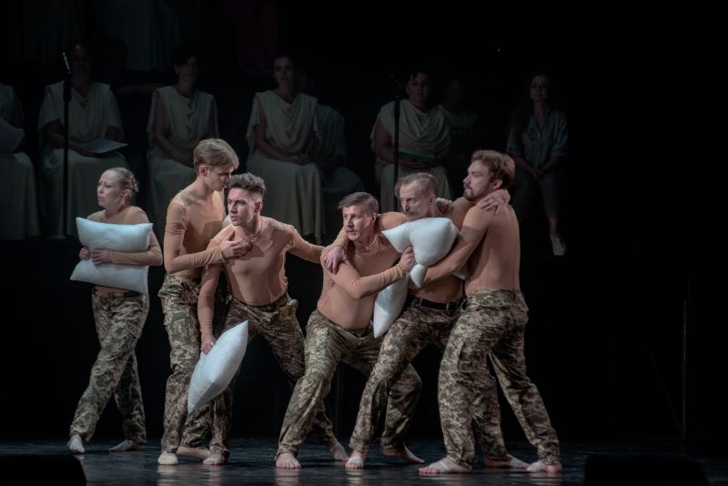 Під час народження нашої вистави ми шукали цікаві творчі рішення, драматичну складову сюжету, аби спів, жива музика оркестру й танець разом складали потужне дійство про наше сьогодення... Наприклад, подушки є елементом сценографії та реквізиту постановки. Чому подушки? Я вважаю, що показувати зброю на сцені - це не комільфо. Ми відмовились без бутафорії. Частину сцени займає поміст, де стоїть хор, а для танцівників лишилося не так багато місця для передачі динамічної хореографії дійства. За сюжетом подушку чоловіку, який йде воювати, дає його кохана жінка. Потім, герой опиняється у таборі й подушка стає елементом для тренування, барикадою, навіть зброєю, а коли герої гинуть, то вона розривається і вилітає Душа... Подушка - це символ дому й оберіг від коханої людини.