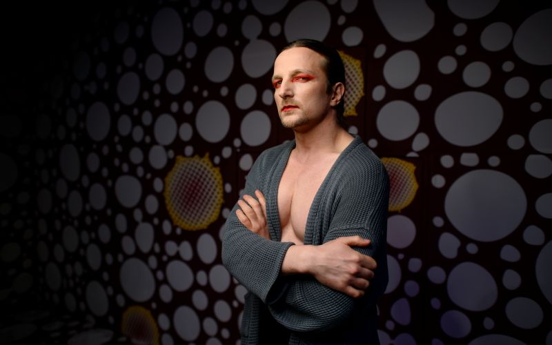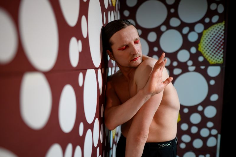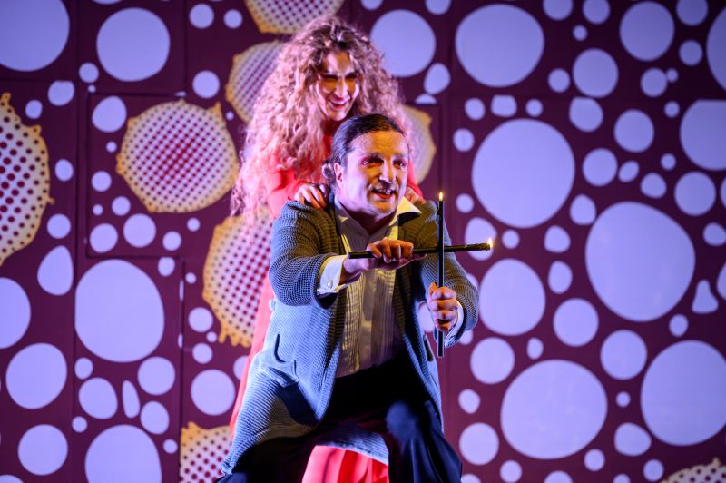 Сцена задекорована у червоний у білих цяточках колір (так у новелі Франко описував сукню Мані, в якій втекла від Хоми й зберегла вподовж трьох років поки блукала світами, пройшовши через страждання і виборюючи своє право стати сильною та вільною). Червоний колір несе й великий психологічний зміст, бо то колір пристрасті, кохання, крові, бажання, поневіряння, надії…