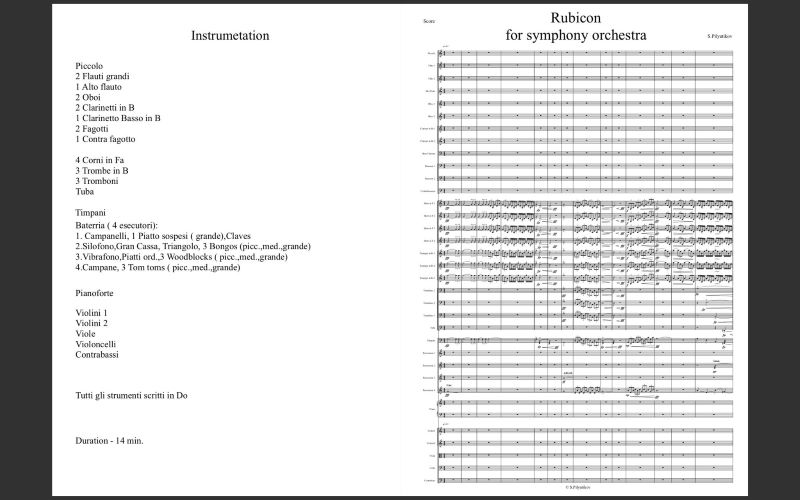 «Зараз головне: вижити!», – сказала мені одна з моїх друзів-музикантів. І так, це дійсно так! Вижити, не згинаючи спини, вижити – без тремтіння в руках, вижити, зімкнувши щити і встояти, розвернувшись обличчям до вогню! І кожен із нас робить вибір: жити, так чи інакше. «Рубікон» – мій новий твір для великого симфонічного оркестру, який я закінчив влітку цього року. 40 сторінок музичного тексту, 452 тисячі музичних знаків-нот, за якими ховаються: мій вибір, мої думки, мої почуття, моя сила, моя боротьба... «Рубікон» – твір вогняний і пристрасний, наповнений драматизмом, боротьбою. Моє місце «сили та віри». «Рубікон» – місце, де Ми, Ти і Я робимо вибір, де ми спалюємо мости, стрибаємо в прірву, назавжди прощаємось з минулим. АЛЕ!.., входимо у нову річку, набуваємо нового світу і п'ємо з нового, чистого джерела...», - каже С. ПІЛЮТІКОВ,