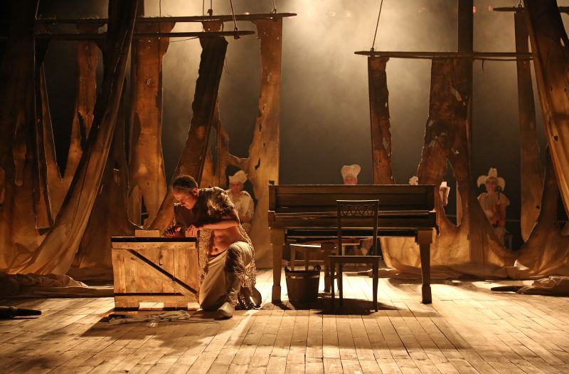 Слухачі також чують і фортепіано (Вадим Аскевич), скрипку (Марія Гаврилюк), віолончель (Любов Баранова), акордеон (Володимир Мішуков). Еклектичне звучання інструментального ансамблю відповідає режисерькому задуму, адже дія вистави відбувається поза часом, вона не прив'язана територіально до жодної країни! Ця історія могла статися будь-де. Тож, з погляду музики - рішення було прийнято влучно - ось це звучання “волт мьюзік” та поєднання класики, сучасного та архаїчного це якраз створює чудовий фон до того, що відбувається на сцені...