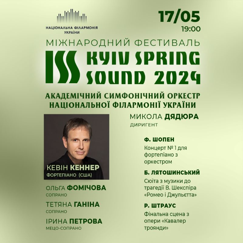 Гостем першого концерту 17 травня стане американський піаніст Кевін Кеннер. Після здобуття перемоги на конкурсі імені Шопена у 1990 році, піаніст уславився як інтерпретатор музики польського композитора. Свою майстерність він продемонструє на Першому фортепіанному концерті – творі 20-літнього Шопена, який вже виявляв зрілу вдумливість із молодечим сплеском почуттів. У продовження концерту прозвучить сюїта з музики до театральної постановки «Ромео і Джульєтта» Бориса Лятошинського, партитуру до якої було нещодавно віднайдено. У ній композитор майстерно поєднує два інтонаційні світи – старовинну бальну музику (для цього Лятошинський використовує мелодії з танців XVI століття) та сучасну експресивну мову для втілення найгостріших сцен з Шекспірової драми.