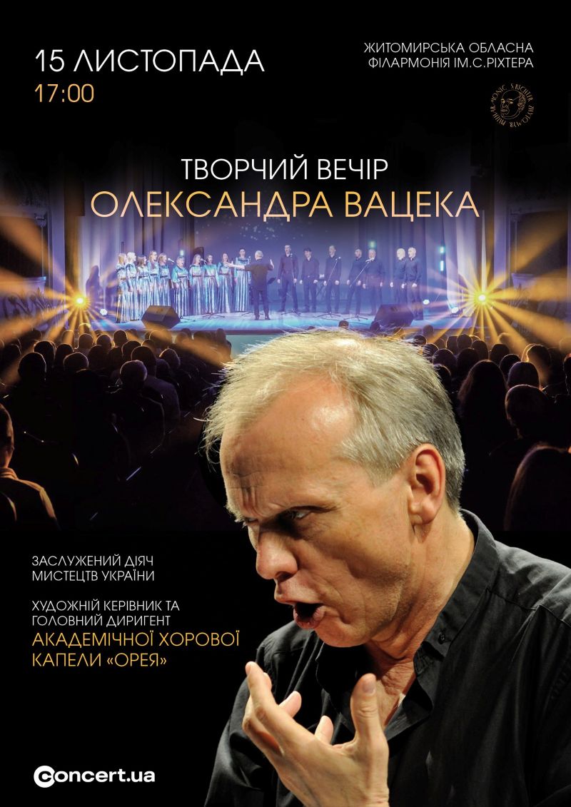 15 листопада У Житомирській обласній філармонії ім. С. Ріхтера відбудеться творчий вечір Олександра Вацека, заслуженого діяча мистецтв України, диригента і натхненника всесвітньо відомої академічної хорової капели «Орея».